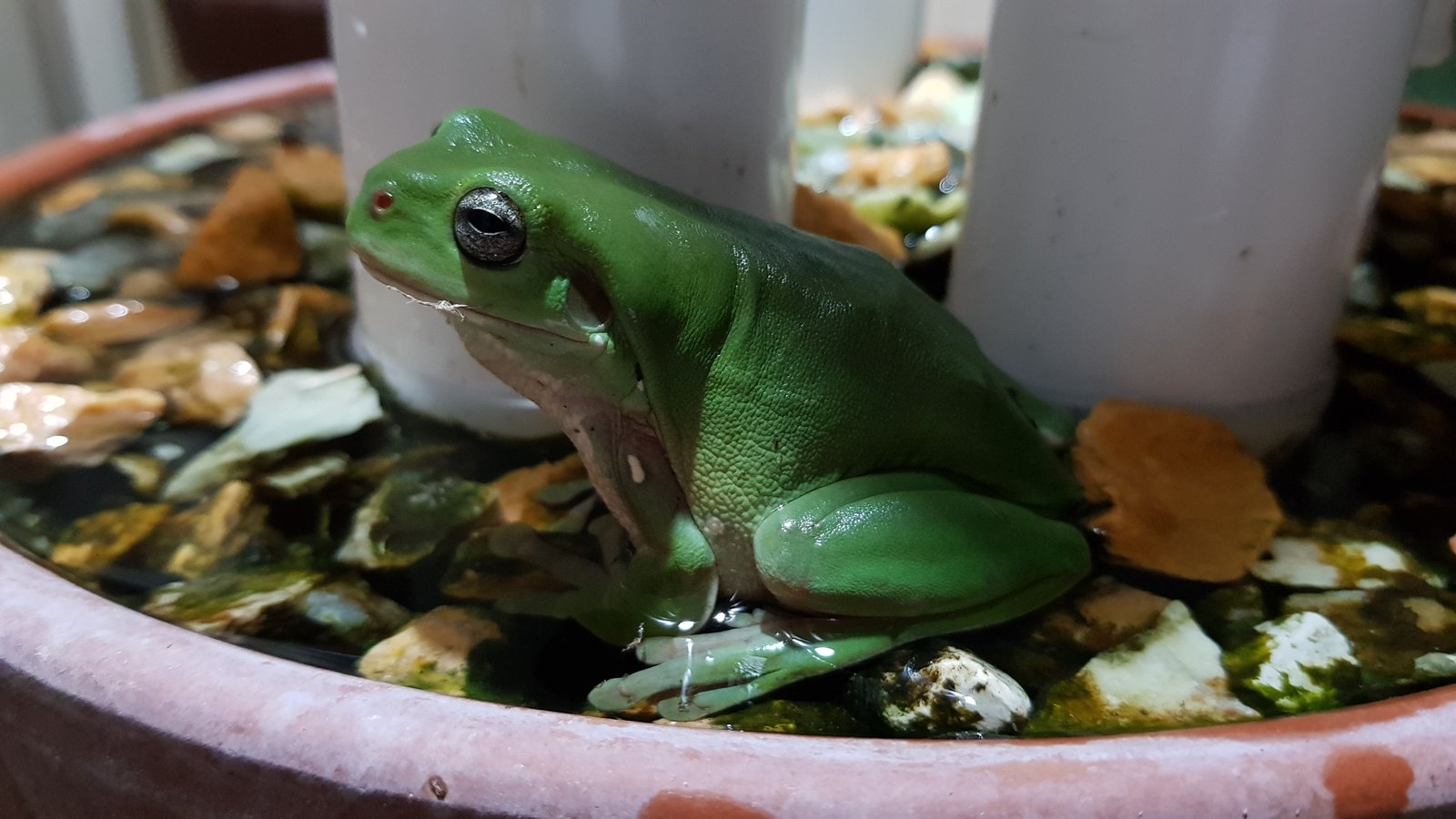 It’s because of their habitats being in decline that they’re more used to being ‘at home’ with human structures, ie. water tanks, rainfall catchment areas such as roof guttering, downpipes and even toilets. Anywhere that provides a relatively safe place with moisture available is where you’re most likely to find them. Since I’ve known them, they’ve been less reliant on tree habitats and moreso on ‘frog hotels’ (pictured, below), which are designed to provide these and other tree frogs with the core elements to daily living: shelterwater and light. Shelter from predators and harsh weather, water for their skin (which is hygroscopic), and light to enable them to catch and eat bugs at night.