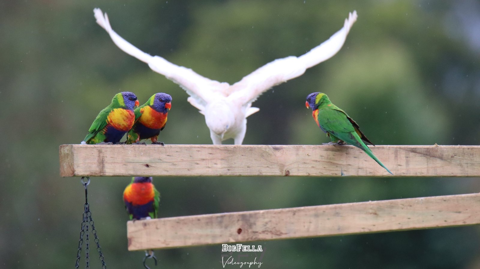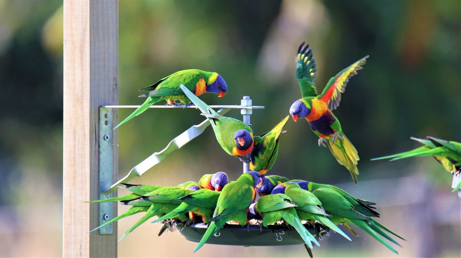 Rainbow Lorikeets flocking for an afternoon feed of apple, banana, pear and strawberries, at the centre of a custom-built bird feeder.