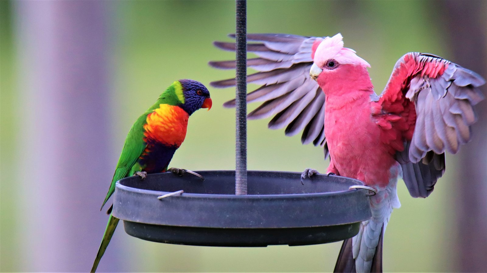 Right: A Rainbow Lorikeet asserts dominance on a Pink and Grey Galah (Eolophus roseicapilla), another regular local species.